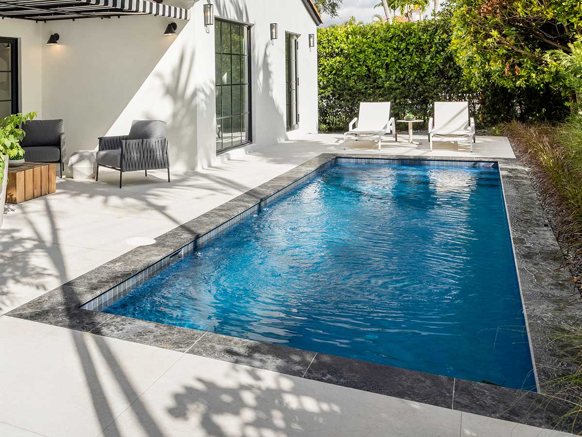 Durable stone finishes were selected for coping and the surrounding pool deck. Abascal Pools recommends sealing certain natural stone products to help maintain beauty and lengthen product lifespan.